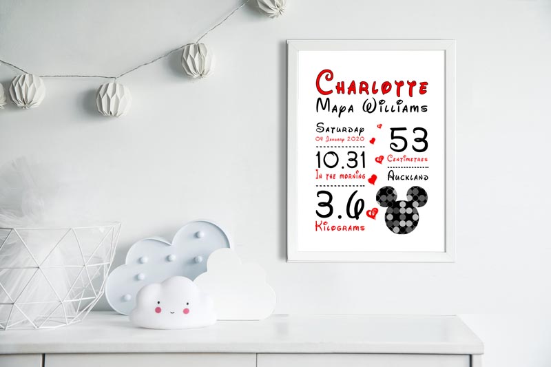 Personalised mouse themed new baby print complete with details including name, birth date, time of birth, weight, height, and place of birth.